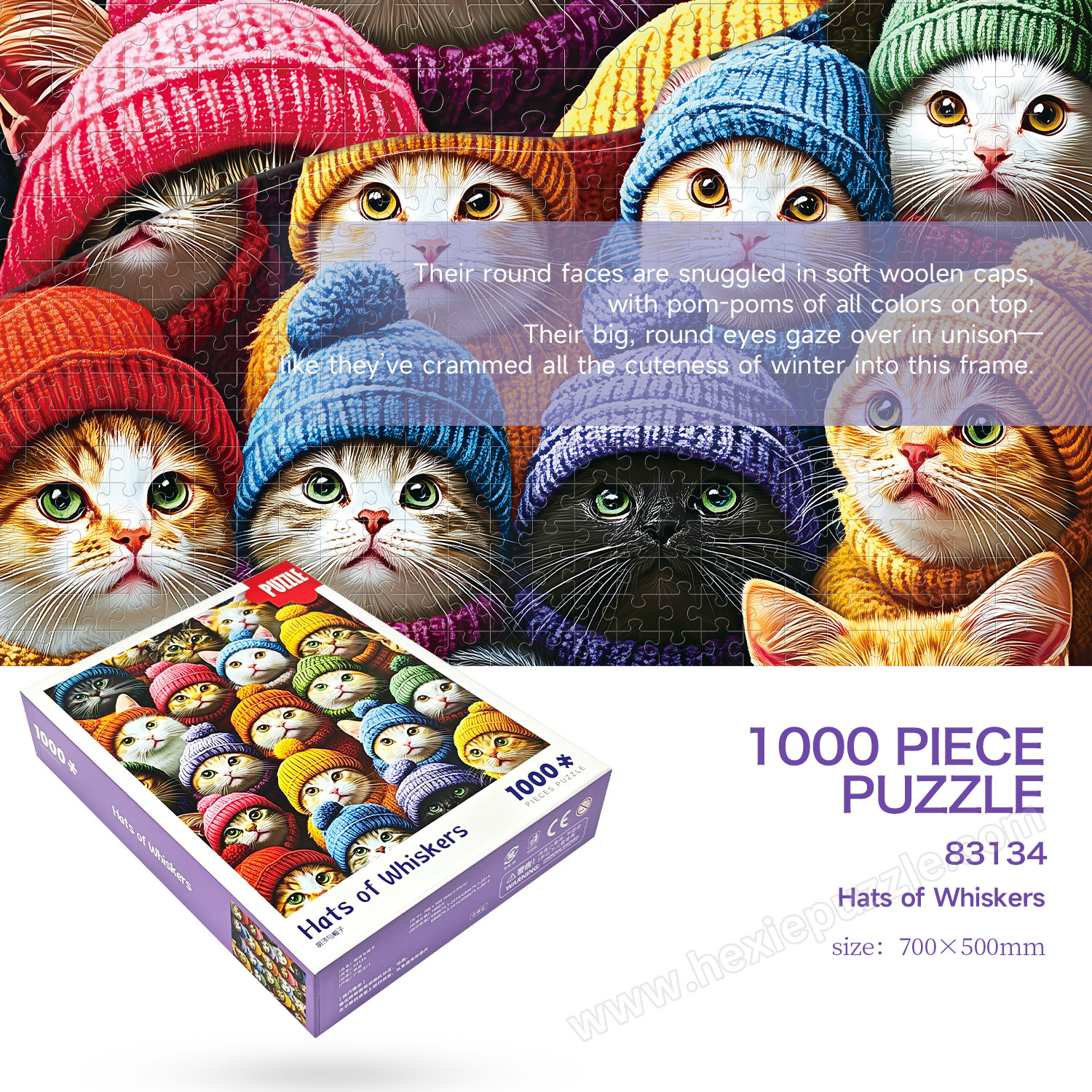 Meet your new favorite pastime! This adorable 1000-piece puzzle features a playful scene of cozy kitties sporting colorful knit hats. It’s the perfect blend of whimsy, challenge, and charm for cat lovers and puzzle fans alike.