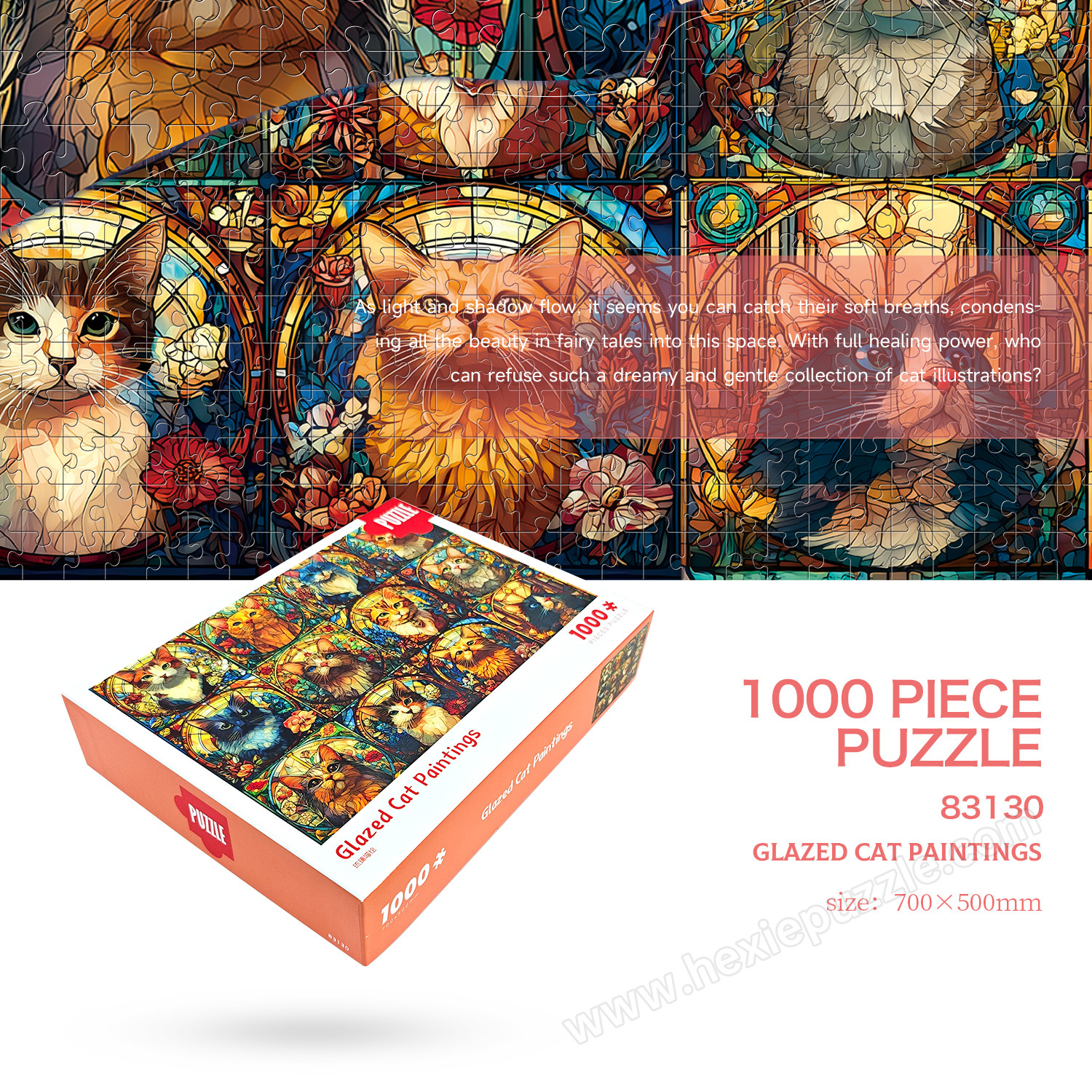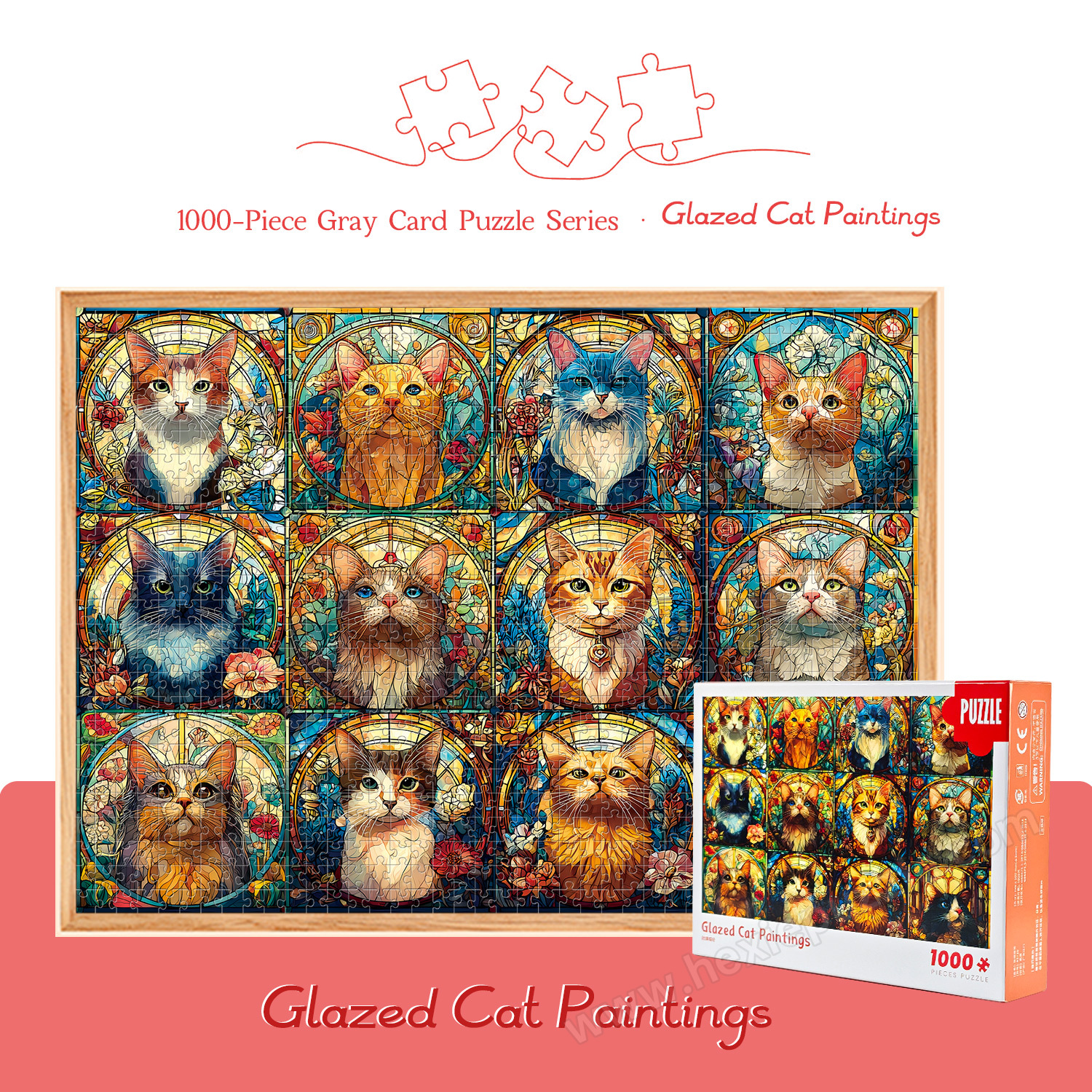 Whether you’re seeking a relaxing solo activity, a unique home decor piece, a fun parent-child activity, or a heartfelt gift, our 1000-Piece Gray Card Glass Cat Painting Sectioned Puzzle checks all the boxes. Click "Add to Cart" now and immerse yourself in the cute and aesthetic world of glass cats!