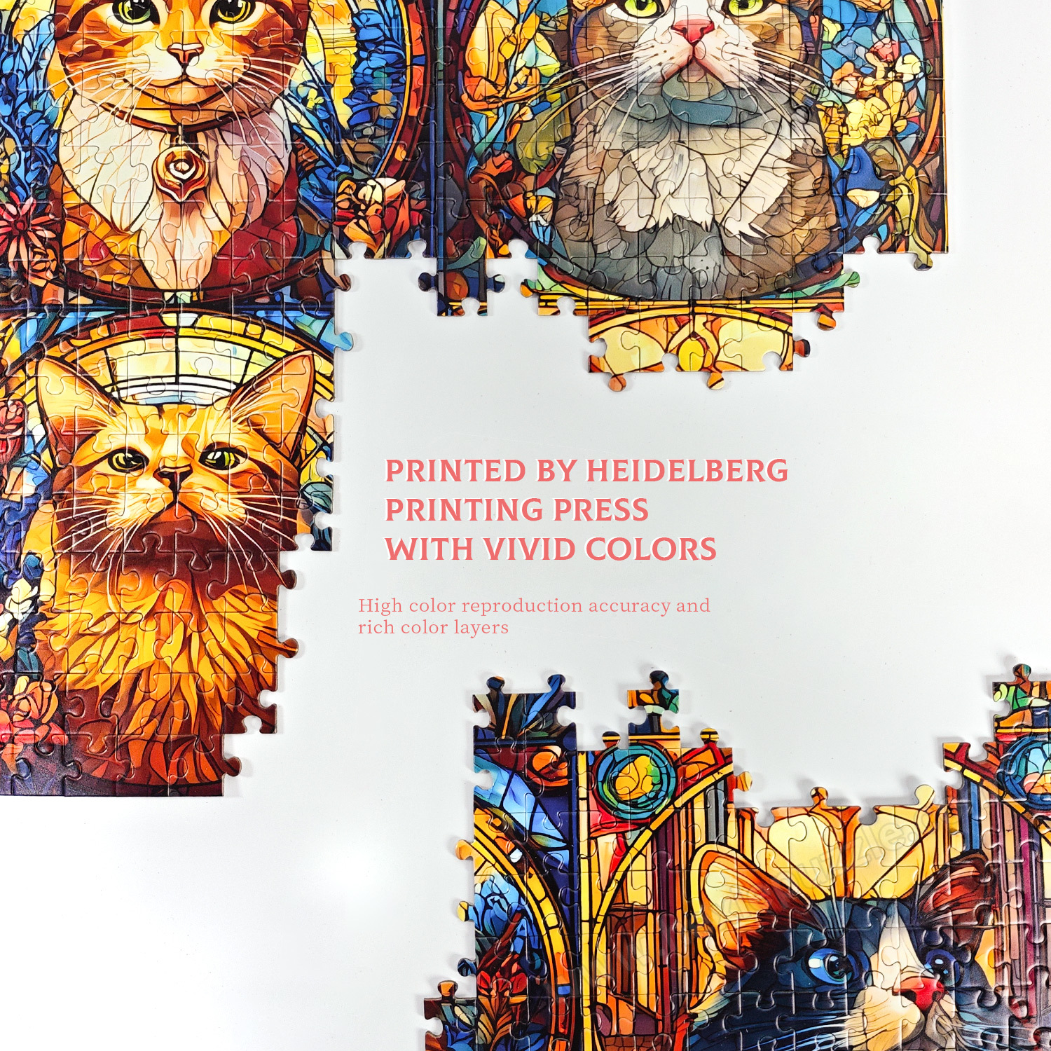 Our puzzle uses an intelligent, zone-based design. It is divided into distinct areas like the cat figures, intricate glass patterns, and background details, making sorting and assembly a logical, stress-free process.