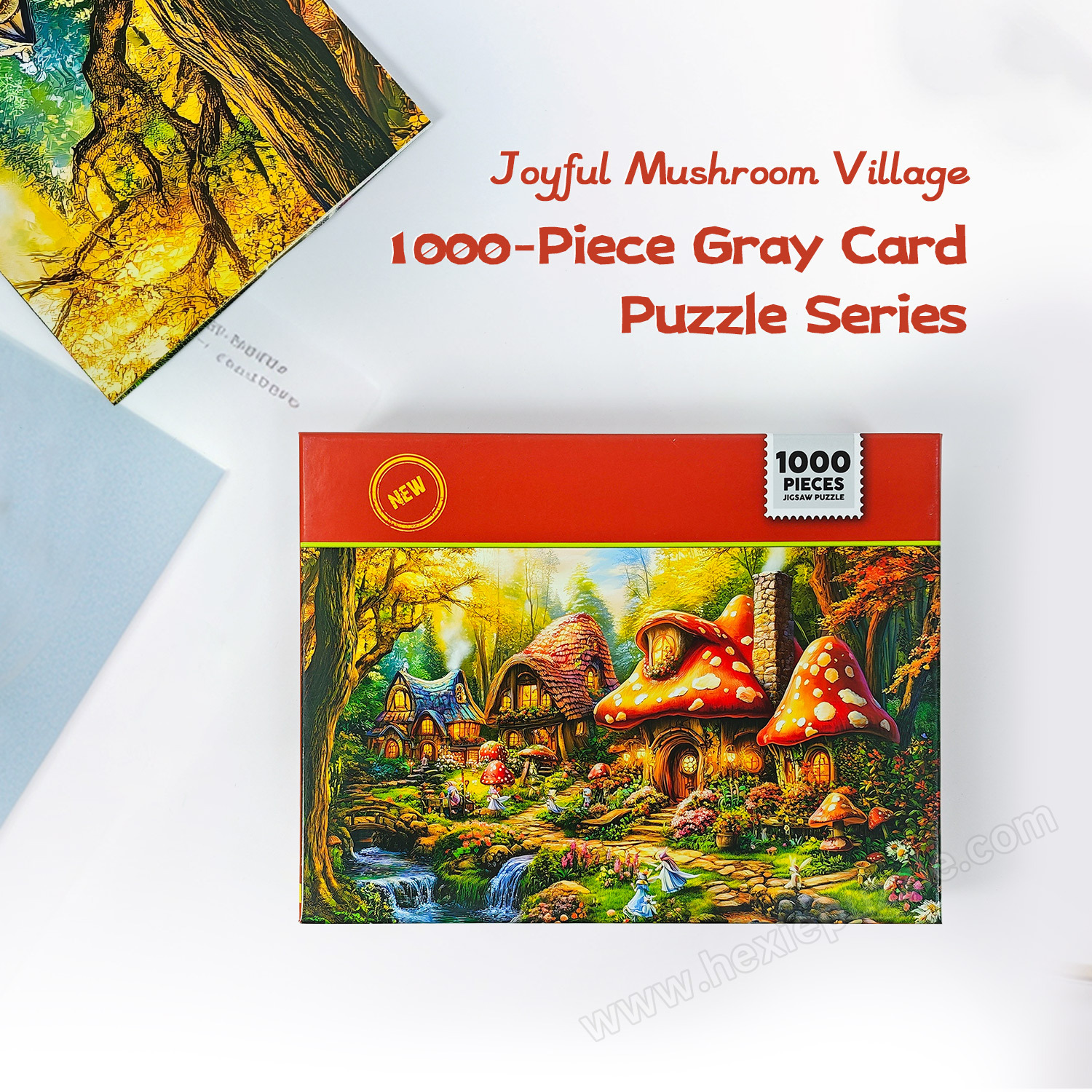 Get the 1000-piece gray card Happy Mushroom Village sectioned puzzle now and start your dream puzzle journey!