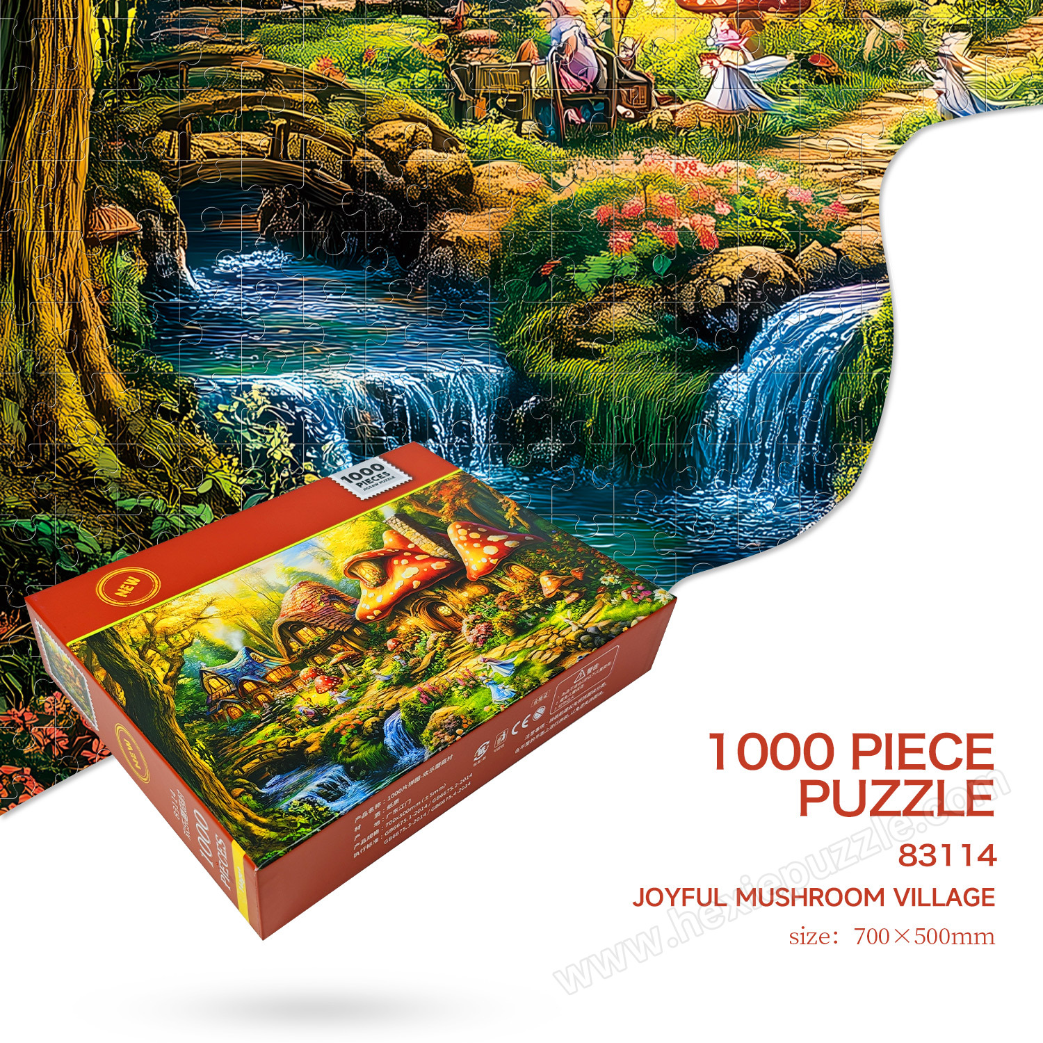 Discover a world of whimsical charm. This 1000-piece puzzle brings to life a dreamy village scene, complete with cozy mushroom houses, cheerful flowers, and friendly animals for an enchanting assembly experience.