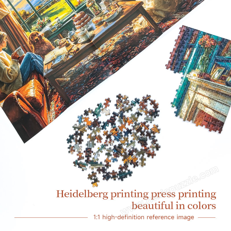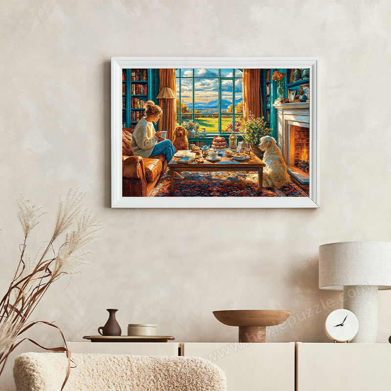 Step into a warm, peaceful living room scene. This 1000-piece puzzle features a cozy sofa, a charming countryside view, a loyal dog, and delightful treats. Perfect for a relaxing, heartwarming creative escape.