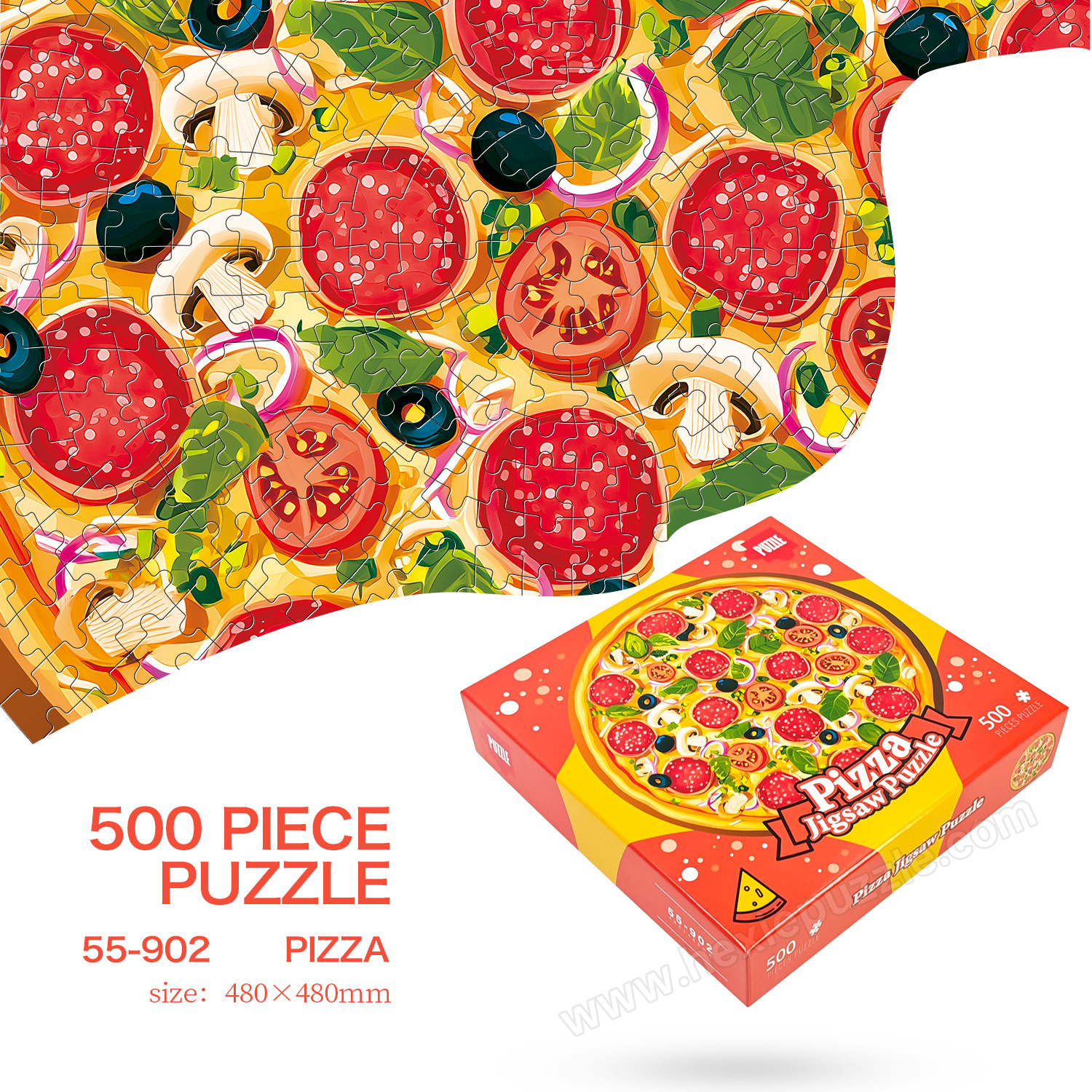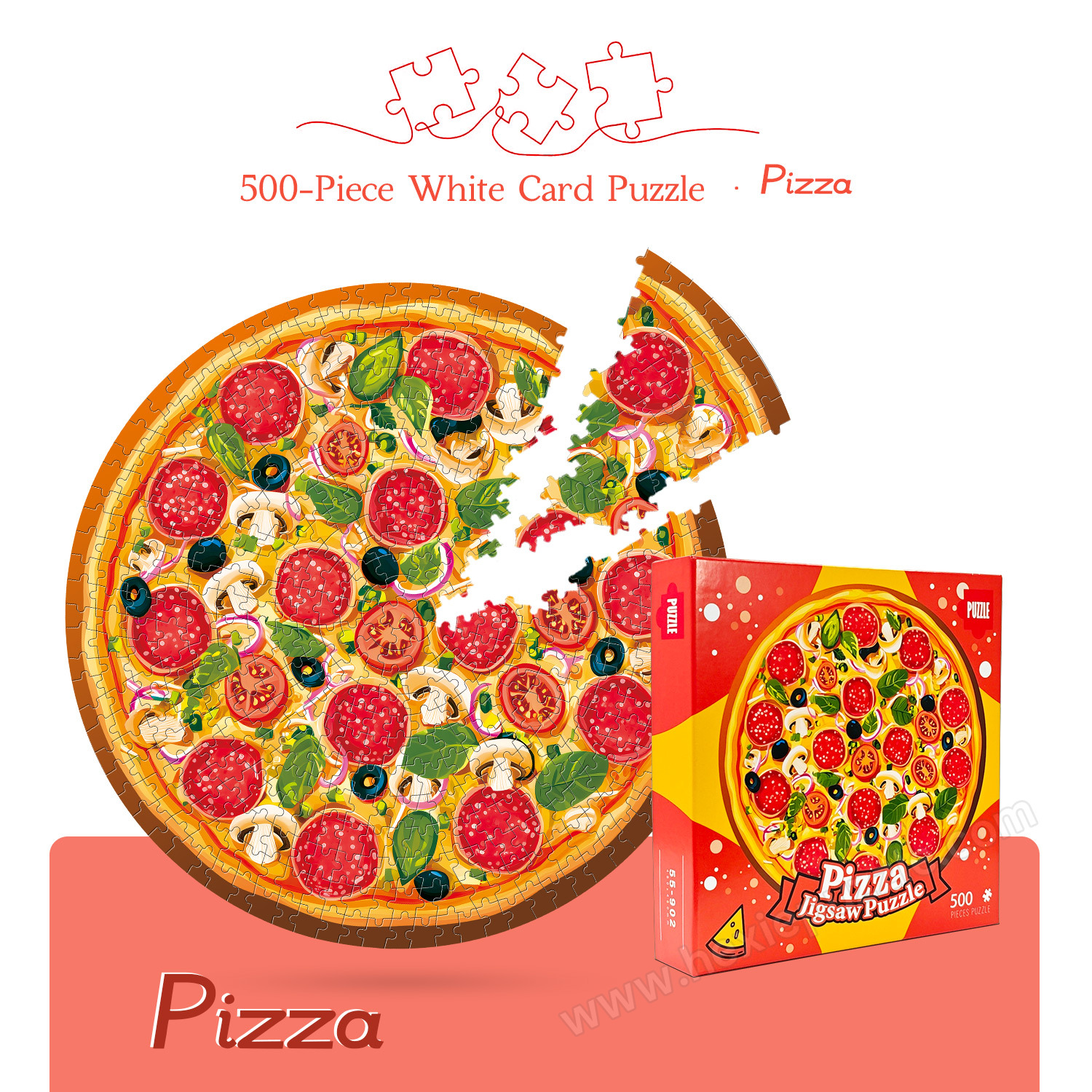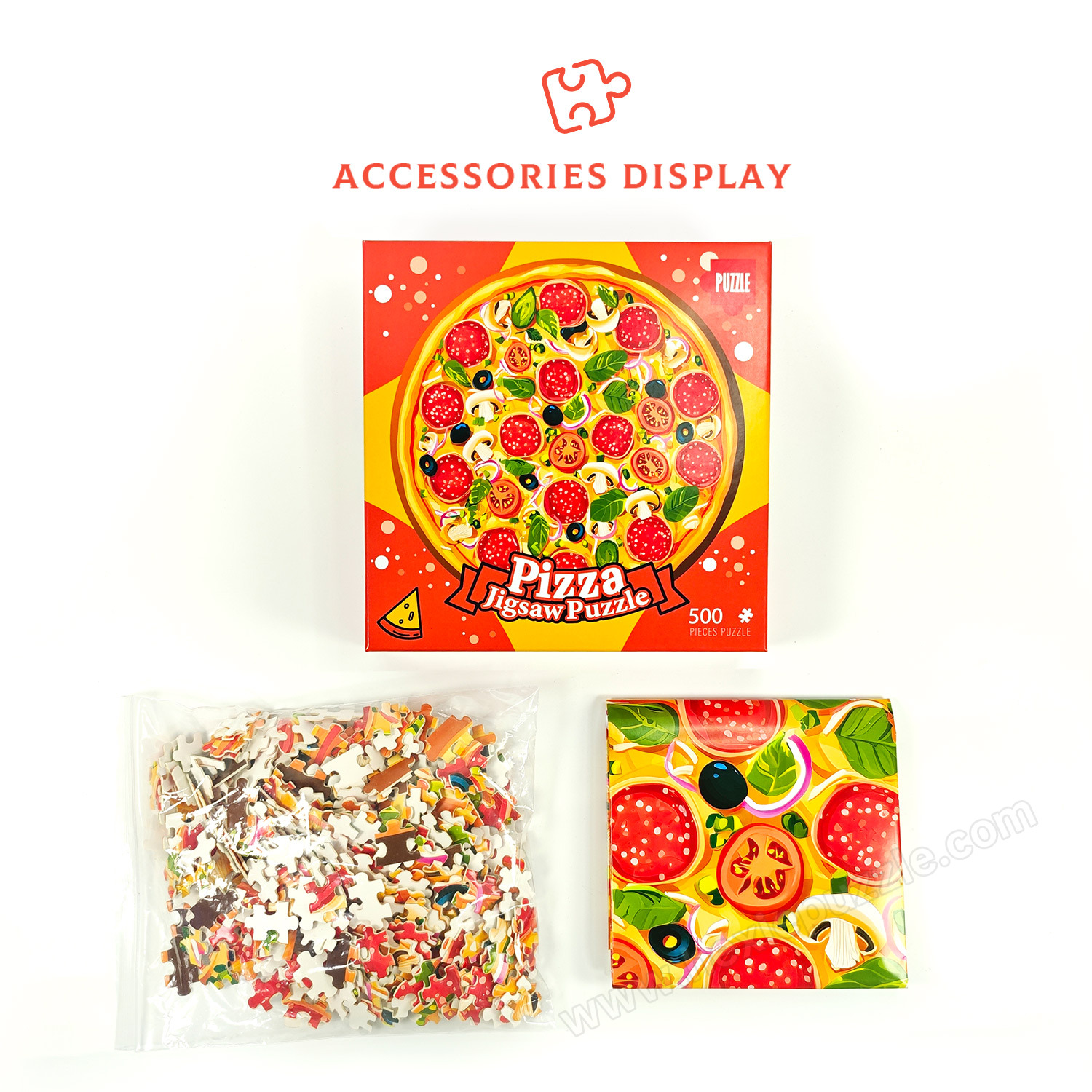A: Each 220*220*48mm color box contains 500 white card puzzle pieces and 1 1:1 reference image of the delicious pizza scene.