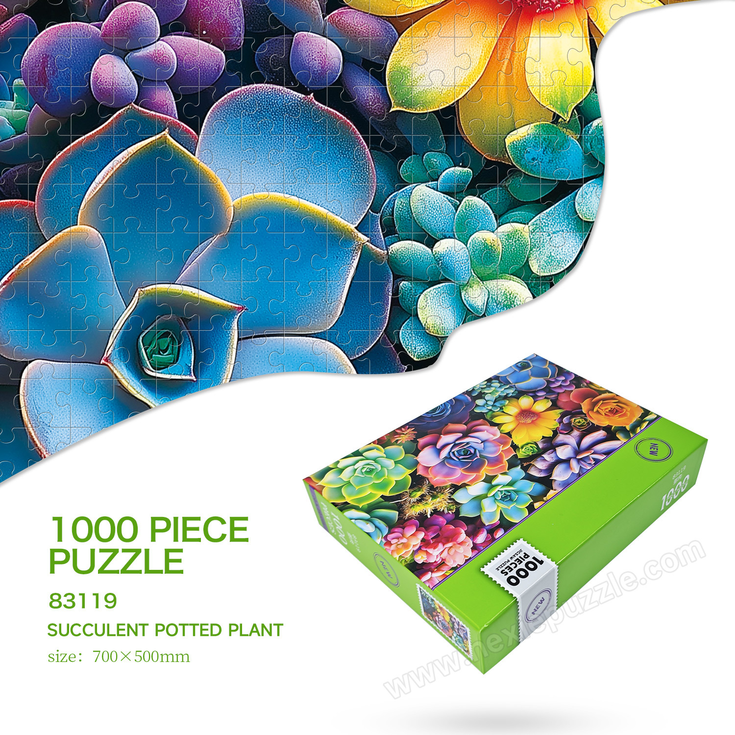 Find your perfect relaxing retreat. This 1000-piece puzzle features a vibrant and diverse collection of plump, colorful succulents, offering a soothing and visually delightful assembly experience.