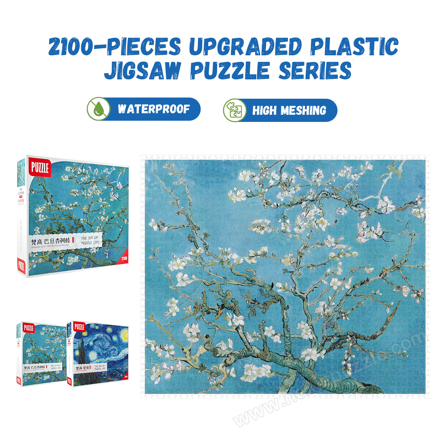 Bring the delicate beauty of van Gogh's Almond Blossom into your home. Whether for personal enjoyment or as a distinctive gift for art lovers, this 2100-piece upgraded plastic puzzle delivers quality, beauty, and lasting value.