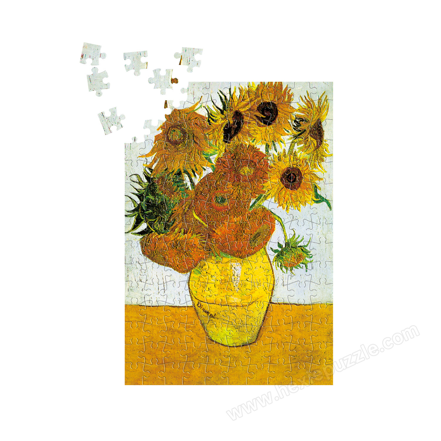 Immerse yourself in the timeless beauty of Vincent van Gogh's iconic Sunflowers masterpiece with this premium 150-piece jigsaw puzzle. Expertly printed on high-quality blue board, every piece captures the vibrant yellow hues and expressive brushstrokes that define this beloved work of art. Designed for both art lovers and puzzle enthusiasts, this complete set includes a wooden frame and 1:1 reference poster, offering a rewarding challenge and a stunning result ready for immediate display.